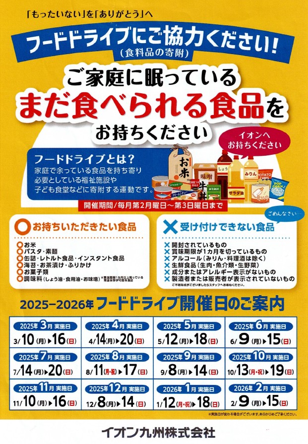 ご家庭に眠っている不要な食品があれば、お持ちください。