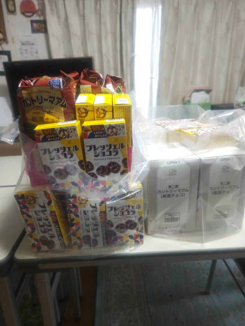 ㈱ショーシンの大津山友季子様からお菓子を50個5キロ位ご寄付いただきました。
